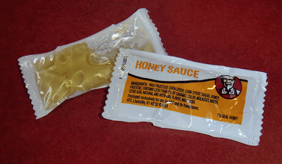 So what on earth is Honey Sauce, and how does it differ from honey? I mean it looks like garden-variety honey, the stuff made by bees. The back of the packet is clear. I squeeze the plastic bag. It moves like honey. I adjust my tri-focals to read the fine print: